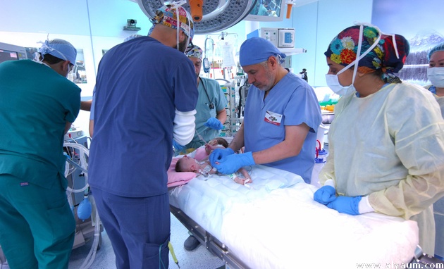 وقال : العملية لم تكن سهلة لوجود اشتراك كبير بين حنين والتوأم الطفيلي فرح ، ووجود تداخل بين الشرايين والأوردة كون فرح متطفلة تعتمد على التغذية من قلب حنين ، وهذا يشكل عبئاً كبيراً على قلب حنين ، لذا كان لابد من التنسيق المسبق ودراسة الحالة الطبية بعناية .