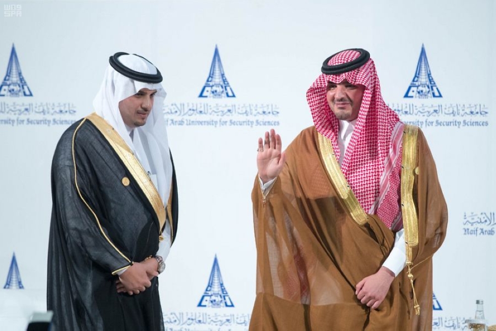 واس – الرياض رعى صاحب السمو الملكي الأمير عبد العزيز بن سعود بن نايف وزير الداخلية الرئيس الفخري لمجلس وزراء الداخلية العرب رئيس المجلس الأعلى لجامعة نايف العربية للعلوم الأمنية اليوم، حفل تخريج طلاب وطالبات جامعة نايف حملة الدكتوراة والماجستير والدبلوم، وذلك بمقر الجامعة في الرياض. واستعرض رئيس الجامعة الدكتور عبدالمجيد البنيان في كلمته بعض مآثر رائد العمل الأمني العربي المشترك الأمير نايف بن عبدالعزيز -رحمه االله- الذي أسهم في تأسيس ودعم مسيرة جامعة الأمن العربية. وبيَّن أن الجامعة نفذت خلال العام الدراسي 1438-1439هـ 18 نشاطًا تدريبيًا شارك فيها 728 مشاركًا ومشاركة من منسوبي الأجهزة الأمنية في الدول العربية الصديقة. كما ألقى الخريج الدكتور سماح المطيري والخريجة الدكتورة شعيع العتيبي كلمتي الخريجين والخريجات أشادا فيهما بالبرامج العلمية الدقيقة التي وفرتها الجامعة لهم، مشيرين إلى تطلعهما وزملاؤهما لمستقبل زاهر بعد أن نهلوا من ينابيع العلم الثرية وتزودوا بالمعارف العلمية والمهارات البحثية على أيدي نخبة من الأساتذة المتميزين. وأعلنت النتيجة العامة للخريجين للعام الدراسي 1438-1439هـ، ثم نظمت مسيرة الخريجين، تسلم بعدها سمو وزير الداخلية درع جامعة نايف من البنيان