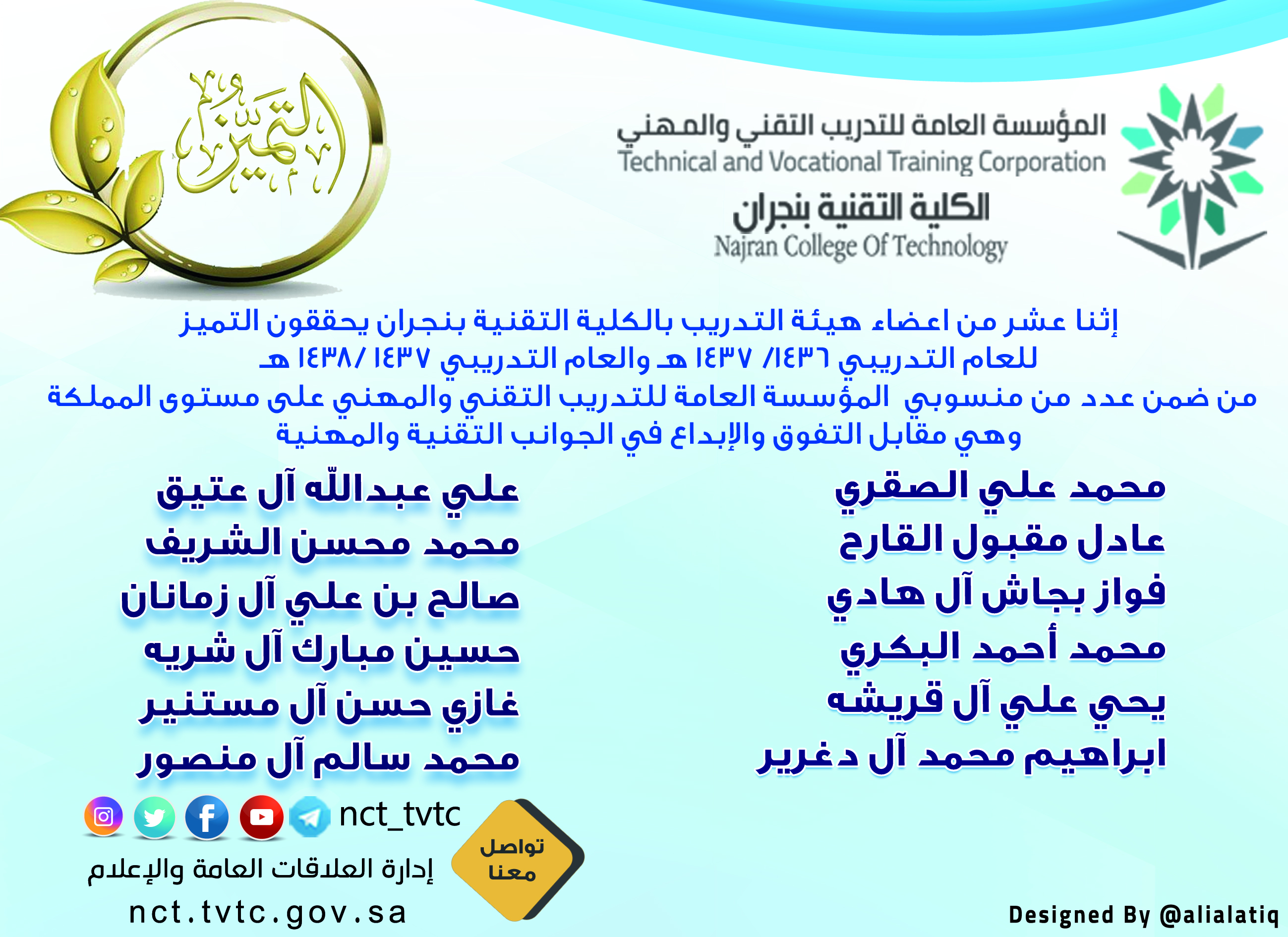 حقق أحدى عشر من اعضاء هيئة التدريب بالكلية التقنية بنجران التميز للعام التدريبي 1436/ 1437هـ والعام التدريبي 1437 /1438هـ من ضمن عدد من منسوبي المؤسسة العامة للتدريب التقني والمهني على مستوى وحداتها التدريبية بالمملكة وهي مقابل التفوق والإبداع في الجوانب التقنية والمهنية وهم: محمد علي الصقري ، عادل مقبول القارح ، علي عبدالله آل عتيق ، فواز بجاش ال هادي ، يحي علي ال قريشه ، محمد أحمد البكري ، صالح علي ال زمانان ، حسين مبارك ال شريه ، غازي حسن ال مستنير ، محمد سالم ال منصور ، ابراهيم محمد ال دغرير ، محمد محسن الشريف.