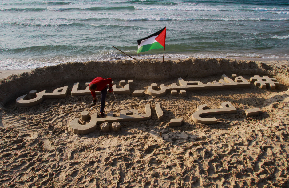 واعتمد طوطح، وهو في الثلاثينيات من عمره من سكان مدينة غزة وأب لأربعة أطفال، على عكازه المتحرك للتنقل في تحركاته على الرمال كي ينحتها بالوسم المذكور.