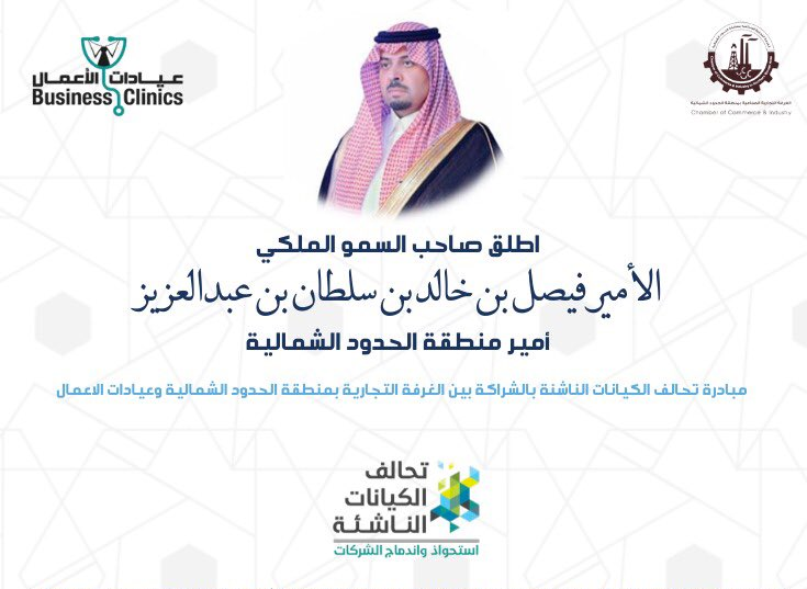 تحت رعاية الأمير فيصل بن خالد بن سلطان أمير منطقة الحدود الشمالية وبمناسبة اليوم العالمي للمشروعات الصغيرة والمتوسطة تنطلق مبادرة تحالف الكيانات الناشئة بالشراكة بين الغرفة التجارية والصناعية بعرعر مع عيادات الأعمال.