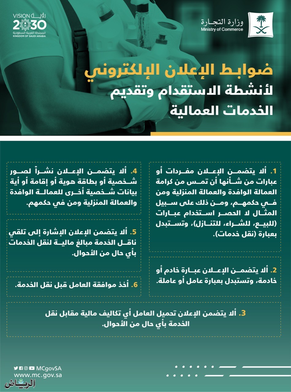 شددت وزارة التجارة على أهمية الالتزام بالضوابط المنظمة للإعلان عن أنشطة الاستقدام ‏وتقديم الخدمات العمالية الصادرة من وزارة المواد البشرية والتنمية الاجتماعية، وفق ما نصت عليه الأنظمة المتعلقة بحقوق الإنسان، وقواعد ممارسة نشاط الاستقدام وتقديم الخدمات العمالية لدى الوزارة وذلك عند القيام بأي إعلان عن أنشطة الاستقدام ‏وتقديم الخدمات العمالية.