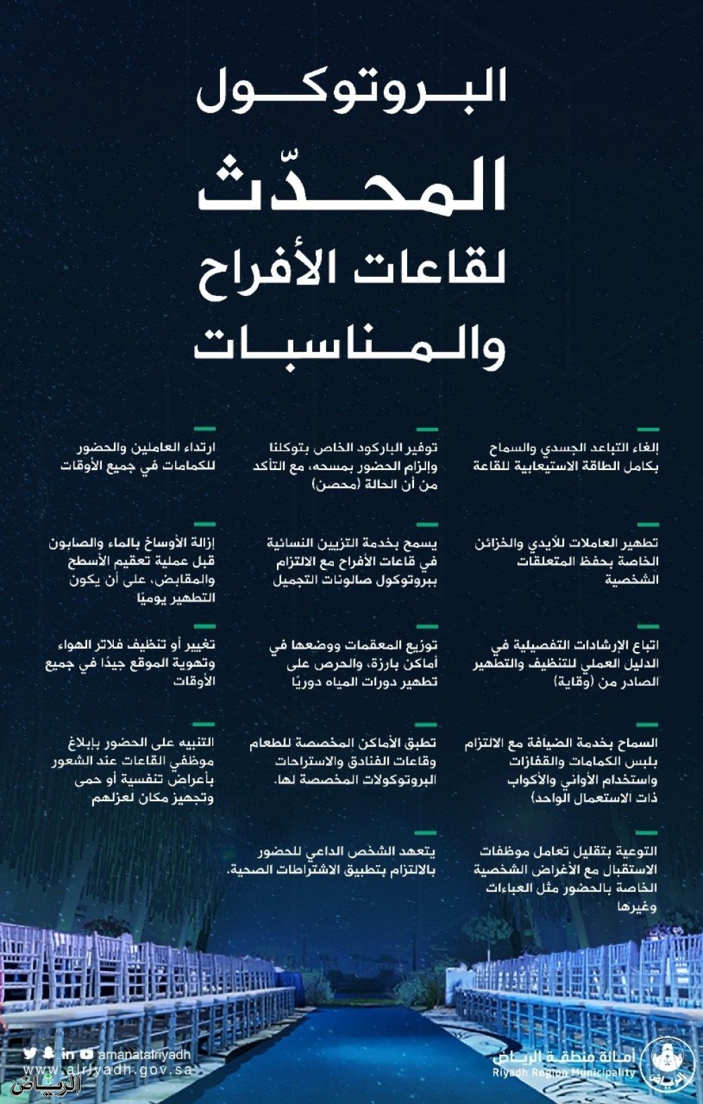 حدثت هيئة الصحة العامة البروتوكول لقاعات الأفراح والمناسبات ومن أبرز التحديثات إلغاء التباعد الجسدي والسماح بكامل الطاقة الاستيعابية للقاعة، بالإضافة إلى توفير الباركود الخاص بتوكلنا وإلزام الحضور بمسحه مع التأكد من أن الحالة “محصن”.