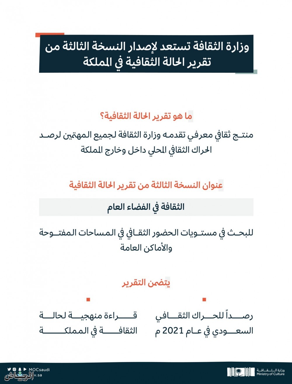 تستعد وزارة الثقافة لإصدار النسخة الثالثة من تقرير “الحالة الثقافية في المملكة العربية السعودية” في شهر يوليو 2022م، الذي سيتضمن رصداً دقيقاً للحراك الثقافي السعودي في عام 2021م، مع حصر لتطوراته ومنجزاته وتحدياته، وذلك تحت عنوان مُخصص هو “الثقافة في الفضاء العام”.
