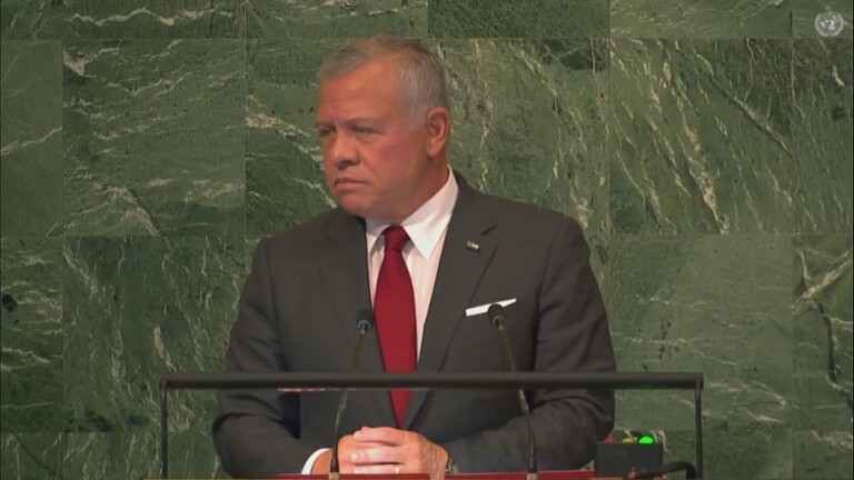 وتحدث العاهل الأردني عن رؤية المملكة للحل، قائلا إن “الطريق إلى الأمام هو حل الدولتين، وفقا لقرارات الأمم المتحدة، الذي يفضي إلى قيام الدولة الفلسطينية المستقلة ذات السيادة والقابلة للحياة على خطوط الرابع من حزيران عام 1967 وعاصمتها القدس الشرقية، تعيش جنبا إلى جنب مع إسرائيل بسلام وأمن وازدهار”.