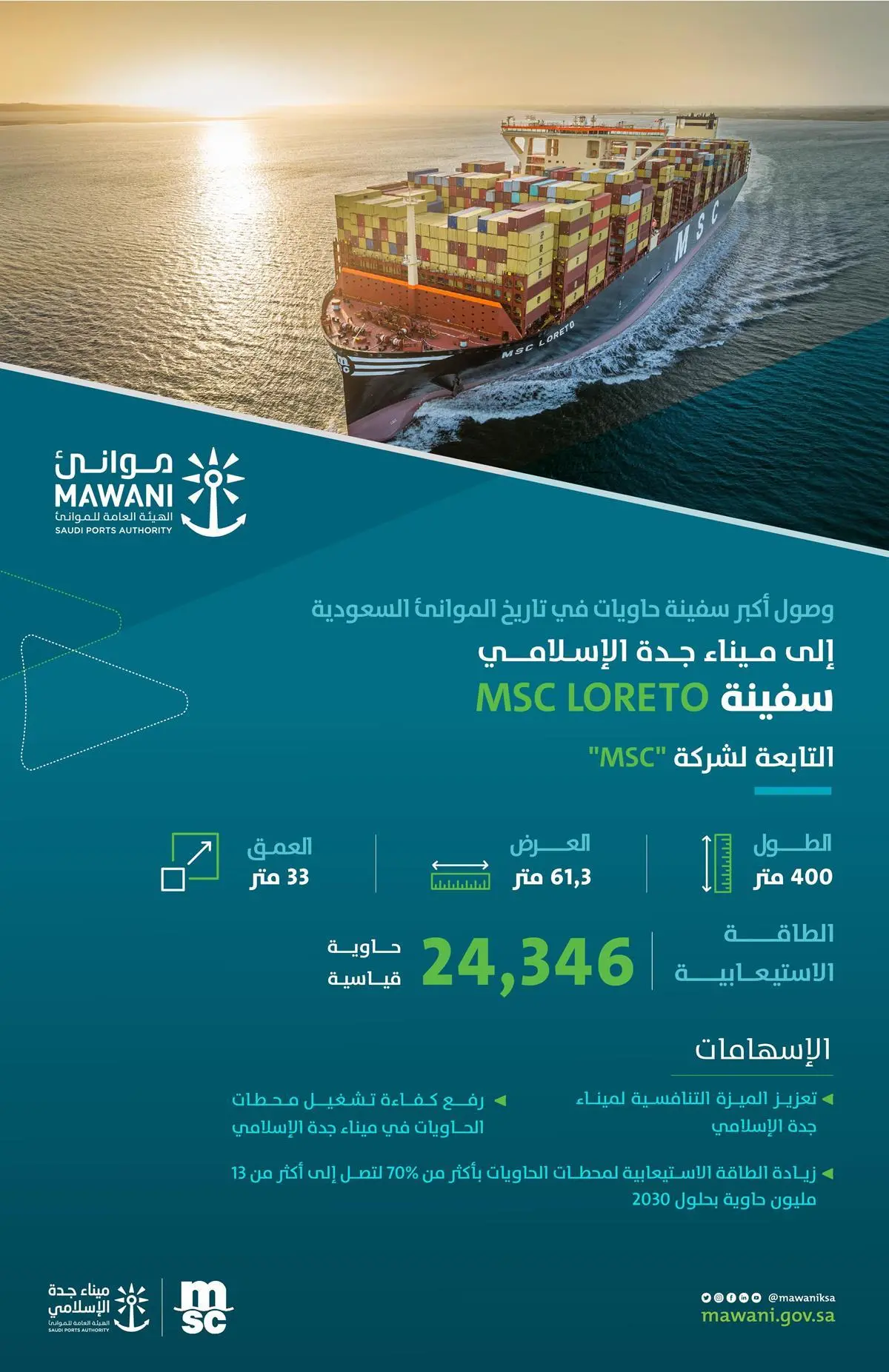 ويعزز وصول السفينة الضخمة إلى ميناء جدة الإسلامي من ميزته التنافسية، ويؤكد تطور البنية التحتية له التي تؤهله لاستقبال سفن الحاويات العملاقة، إذ شهد ضمن عمليات التطوير تعميق قناتي الاقتراب وحوض الدوران والممرات البحرية وحوض المحطة الجنوبية، إضافة إلى عمليات التوسعة المستمرة، وعقود الإسناد التجاري، التي أسهمت في رفع كفاءة تشغيل محطات الحاويات بالميناء، وزيادة الطاقة الاستيعابية لمحطات الحاويات بأكثر من 70% لتصل إلى أكثر من 13 مليون حاوية بحلول 2030. وتنقل السفينة “MSC LORETO” مجموعة واسعة من البضائع من المواد الخام إلى المنتجات النهائية، مثل الآلات والبلاستيك والمطاط والإلكترونيات والأثاث، وهي جزء من سلسلة من 6 سفن عملاقة، كما أنها مجهزة بتقنيات وميزات حديثة تجعلها فعالة في استخدام الطاقة والوقود.