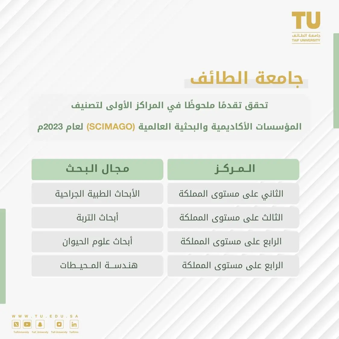 جامعة الطائف تحقق تقدمًا ملحوظًا في المراكز الأولى لتصنيف المؤسسات الأكاديمية والبحثية العالمية (SCIMAGO) لعام 2023م