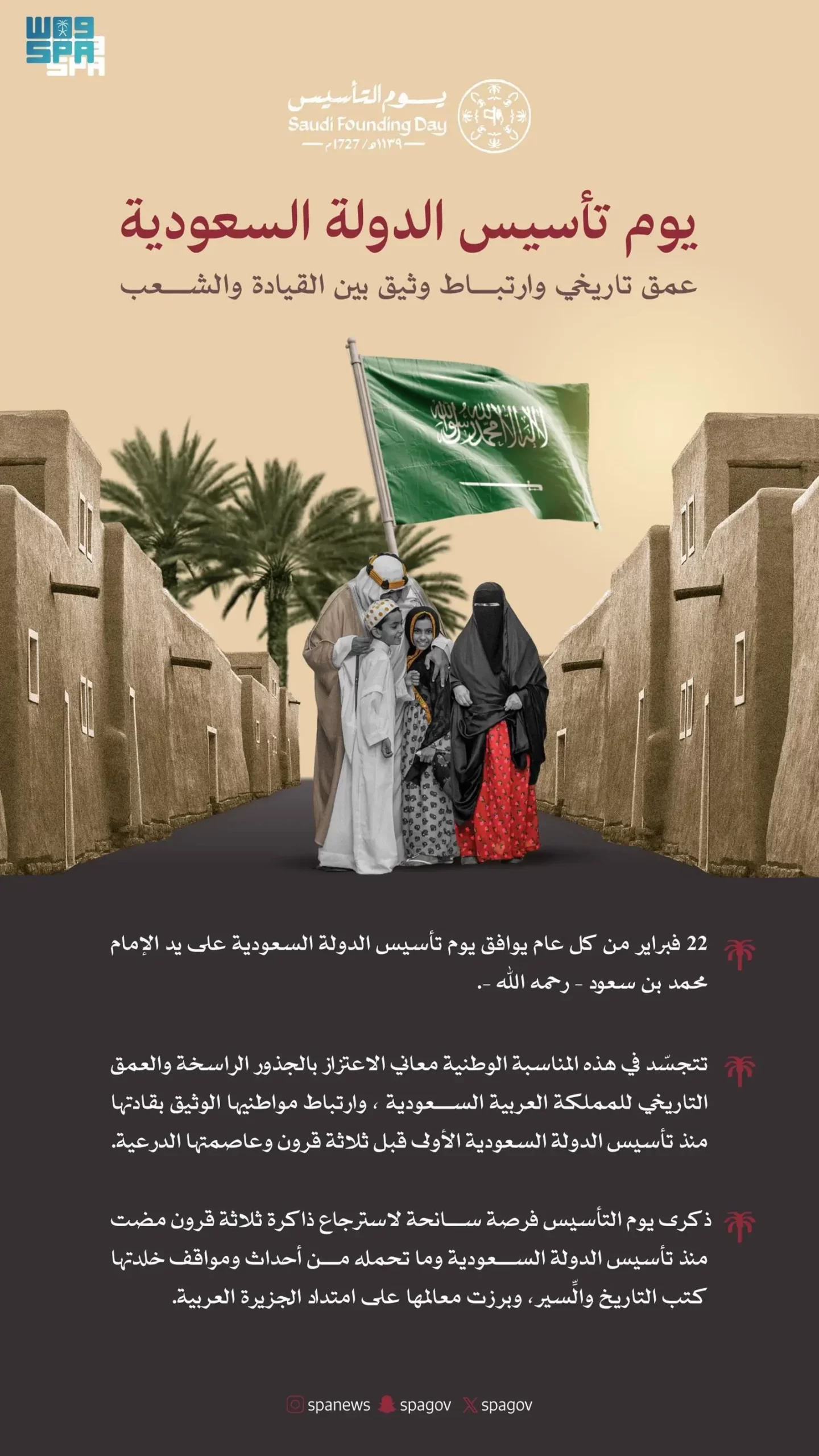 وتتجسّد في هذه المناسبة الوطنية معاني الاعتزاز بالجذور الراسخة والعمق التاريخي لهذه الدولة المباركة، وارتباط مواطنيها الوثيق بقادتها منذ تأسيس الدولة السعودية الأولى قبل ثلاثة قرون وعاصمتها الدرعية ودستورها القرآن الكريم وسنة رسوله صلى الله عليه وسلم حتى وقتنا الحاضر.