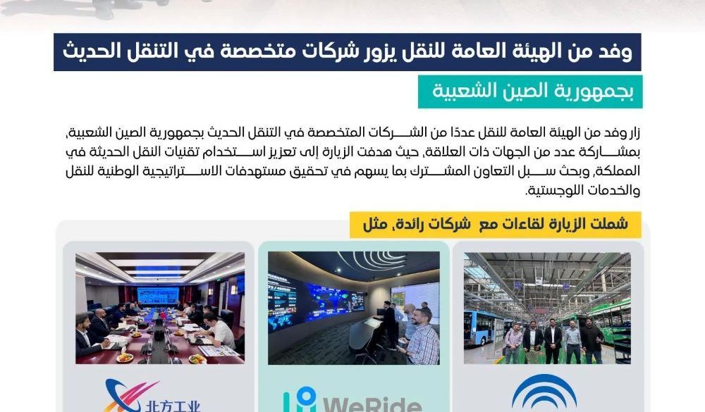 زار وفد الهيئة العامة للنقل عددًا من الشركات الصينية المتخصصة في مجال تقنيات التنقل الحديث، والمركبات ذاتية القيادة، وصناعة الحافلات، في جمهورية الصين الشعبية، بمشاركة عدد من الجهات ذات العلاقة بخدمات النقل في المملكة.