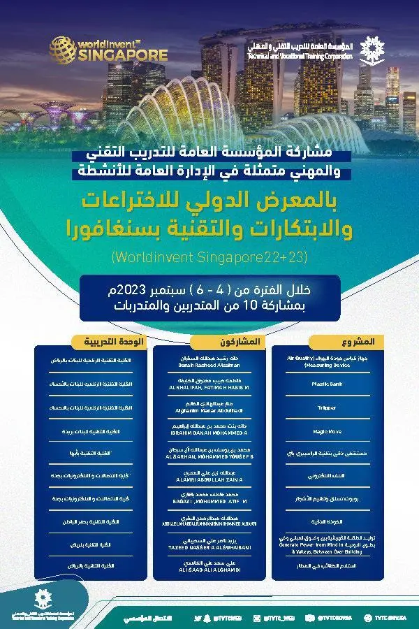 تشارك المؤسسة العامة للتدريب التقني والمهني في المعرض الدولي للاختراعات والابتكارات والتقنية بسنغافورا (Worldinvent Singapore22+23), خلال الفترة ما بين 4 – 6 من شهر سبتمبر القادم 2023م، بمشاركة 10 من المتدربين والمتدربات من المنشآت التدريبية بمختلف مناطق المملكة، وذلك ضمن جهود المؤسسة في اكتشاف الموهوبين والمبدعين، وتأهيلهم للوصول للمشاركات الدولية.