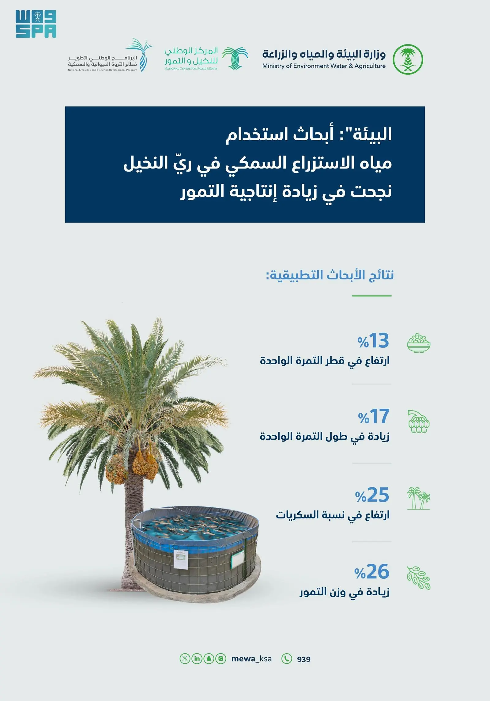 أكدت وزارة البيئة والمياه والزراعة، أن النتائج البحثية النوعية لمشاريع الاستزراع السمكي بالنظام المغلق، أظهرت نجاحها في زيادة كفاءة وإنتاجية أشجار النخيل في المملكة، وذلك باستخدام مياه صرف أحواض مزارع الأسماك كمياه الريّ؛ التي تُقلل من الحاجة لإضافة بعض العناصر الغذائية التي تحتاجها أشجار النخيل كالأسمدة، لاحتواء مياه مصارف الأسماك على تراكيز مختلفة من هذه العناصر المهمة.
